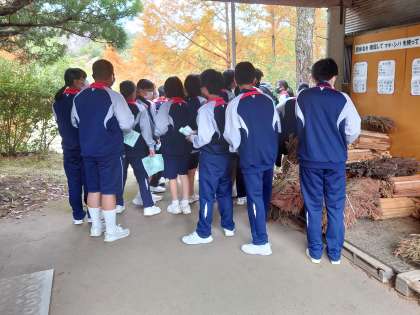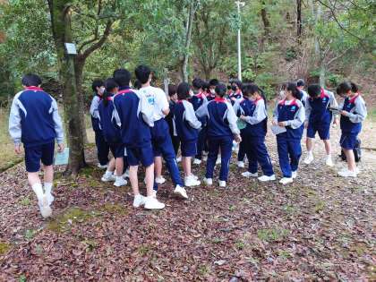 野外オリエンテーリングの様子です。班全員で協力し合ってクイズに答えています。