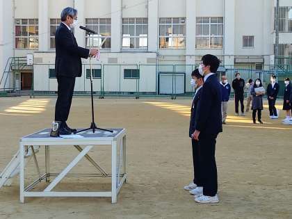 本日の全校集会の中で、「大阪市中学校秋季総合体育大会」において、第3位に入賞されたラグビー部の表彰を行いました。おめでとうございます。よく頑張りました!