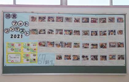 1年生の朝食フォトコンテストの作品が北館階段踊り場に掲示されています。栄養バランスや食べやすさなどをよく考え、工夫を凝らした作品ばかりです。来週からの懇談で来校された際にぜひご覧ください。