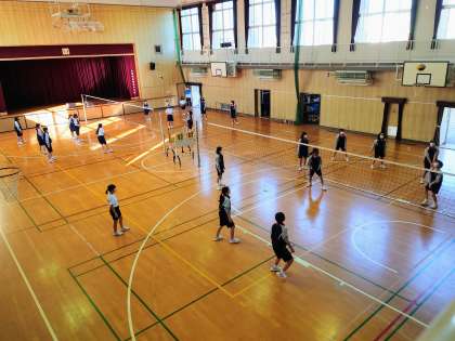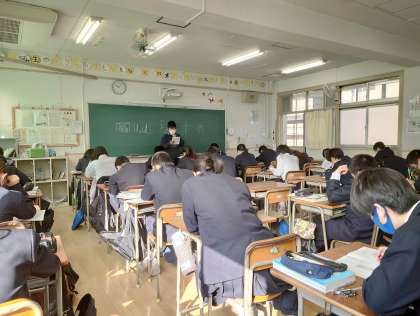 本日の授業風景です。上の写真から1年1・2組女子保健体育(バレーボール)、2年4組国語、3年4組数学です。今日も一日頑張りましょう。