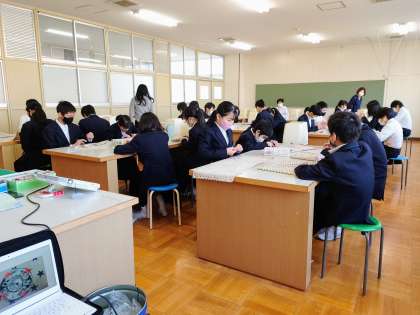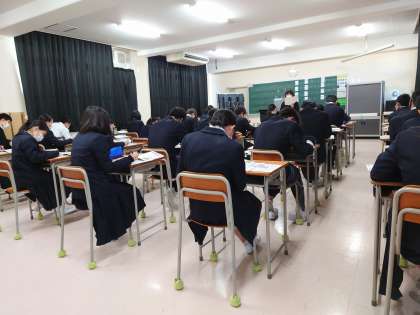 本日の授業風景です。上の写真から1年1組家庭科(クロスステッチ)、2年1・2組女子保健体育(バスケットボール)、3年3組音楽です。今週から始まった進路懇談も今日で3日目です。進路希望を定め、その目標に向かって邁進してください。
