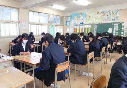 本日の5・6時間目の各学年の取組です。1年生は百人一首、2年生は仕事調べの発表、3年生は来週から行う校長面接の事前指導と卒業文集の下書きを行いました。3年生の皆さんにとって、中学校生活で一番思い出に残っていることは何でしょうか。また面接で聞かせてください。