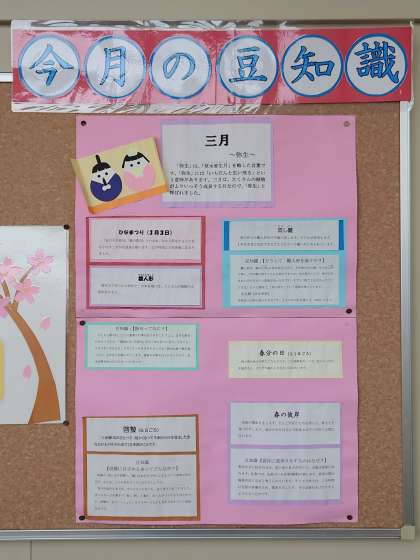 図書室前の掲示板です。図書館補助員の方が工夫を凝らして作成された「今月の豆知識」が掲示されています。図書室にはたくさんの本がありますので、ぜひ本に親しんでほしいと思います。