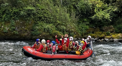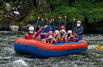 晴天のなか、吉野川のラフティングを、水しぶきをあげて、自然とスリルを楽しんでいます。