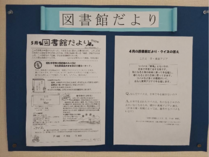 5月の図書館だよりを学校司書の松下さんが作成してくださり、生徒にも本日配布予定です。