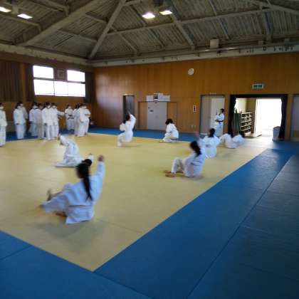 まず、写真(1年女子)のような後ろ受け身など受け身を習得し、投げ技を学んでいきます。