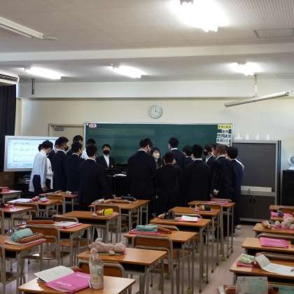 男子生徒は音楽室のグランドピアノを囲み、音楽の先生の伴奏に合わせて歌っています。