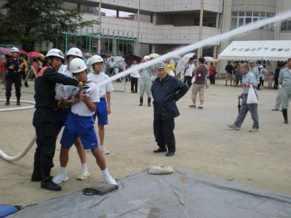 当日の雨により、体育館で三角巾の使い方や簡易担架の作り方などの訓練を行いました。最後に小雨になった時間帯に放水訓練も行う事が出来ました。様々な知識を学び、有意義な訓練を行うことができました。