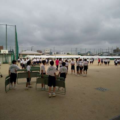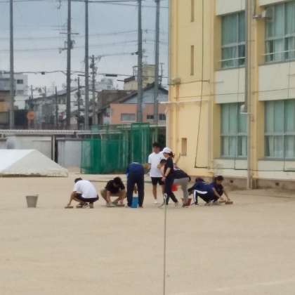 昨晩から早朝の雨で、グランドは水浸しでしたが、係生徒・教職員が懸命に水取りなどグランド整備を行い、体育大会を実施する目途がたちました。