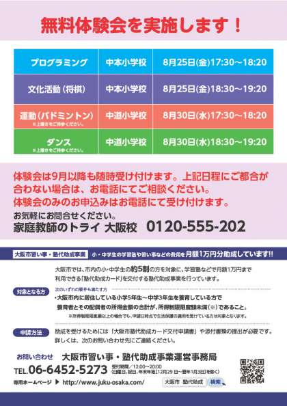 東成区では、9月より中道小学校、中本小学校の施設を利用し、児童生徒の「心の居場所づくり」を目的とした放課後の運動・文化活動を実施します。