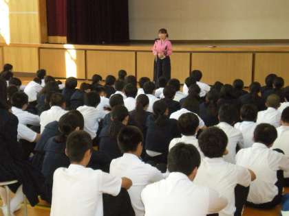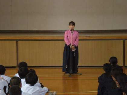 2年生では、学年目標の「お互いの“ちがい”をわかり合う」に向けて、3年間を通した人権学習に取り組んでいます。今回は「在日朝鮮人共生学習」を行い、昨年に引き続きキム・ソンセンニムに来校していただき、貴重なお話を聞かせていただきました。