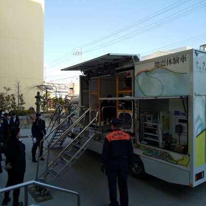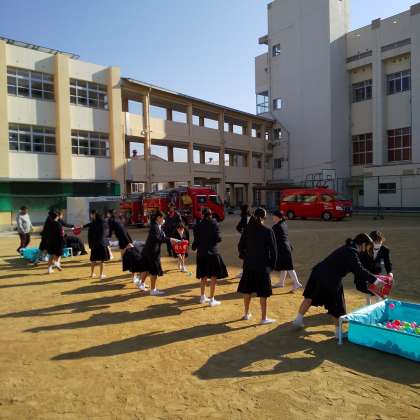 その後、1年生は東成消防署のみな様から、可搬式ポンプ・起震車による地震体験・消火器の使用方法、簡易担架づくりについて学習しました。