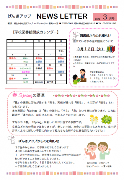今年度最後の元気アップニュースレター3月号をコーディネータさんから、発行されました。