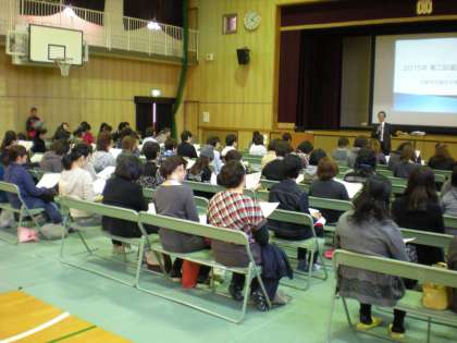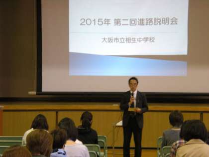 2016年に行われる入試変更点を中心に、進路指導主事から説明を行いました。公立高校入試ではいくつもの変更点があり、3年生だけでなく1・2年生の保護者も熱心に新しい入試制度の説明を聞かれていました。
