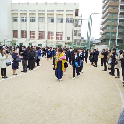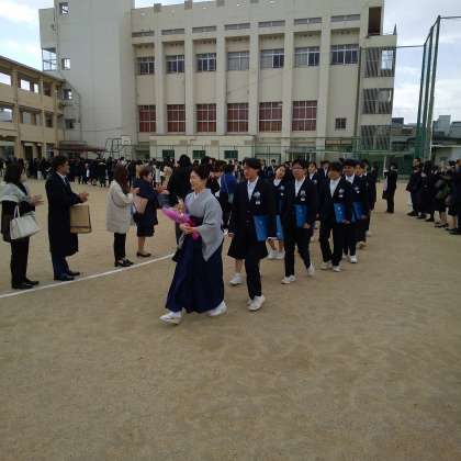 卒業式のあと、グランドの花道を学級ごとに歩きました。