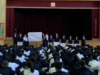 校長先生のお話のあと、各部活動の部長より、相生中学校で部活動を行うにあたって8つの大切なことを「部活動〜8つの誓い〜」と称して紹介がありました。