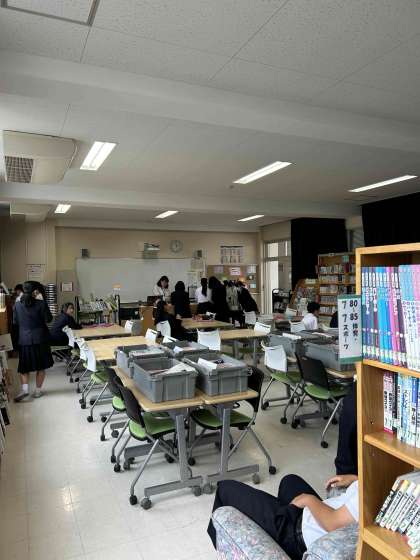 今日のお昼休みの図書室の様子です。学校司書さんが来られていたので、本の貸し出し・返却の他にも、話をしに来る人たちもたくさん集まっていました。生徒のリクエストに応じて本を揃えることもできます。1年生は図書室のオリエンテーションを、まだ受けていませんが、興味のある人はぜひ足を運んでください!