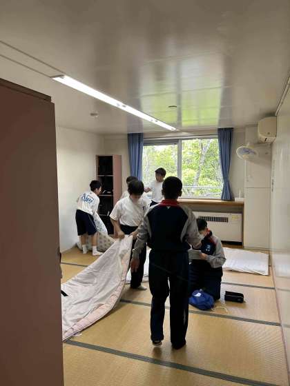 入所し、各部屋ごとに避難経路の確認と寝具の準備を行いました。