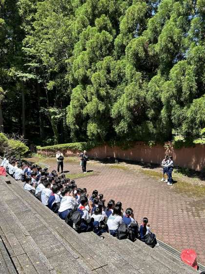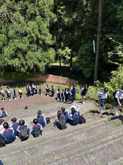 係の生徒の「作ってくれた方に感謝をして、ごちそうさまをしましょう」という言葉の後、みんなで「ごちそうさま」をしました。 この後は移動してオリエンテーリングです。