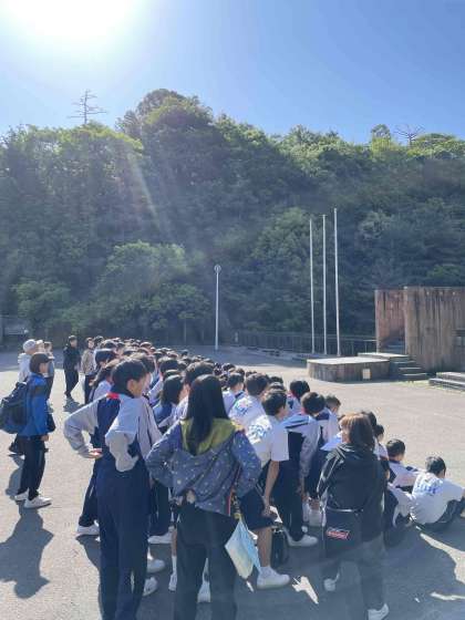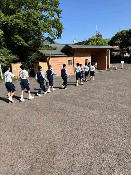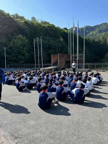 体操後、全体での写真を撮りました。その後これからの動きを確認し、クラスごとに食堂へ移動します。