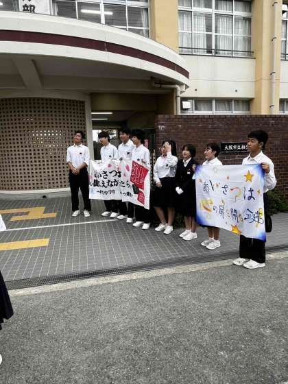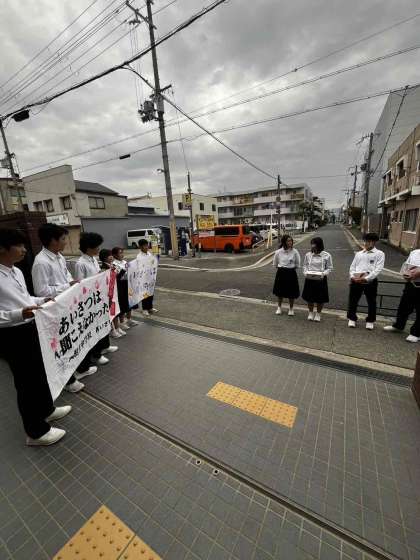 本日15日(金)まで、生徒会の生徒を中心に「登校指導とあいさつ週間」として、正門前にてあいさつ運動の取り組みを行っています。