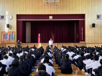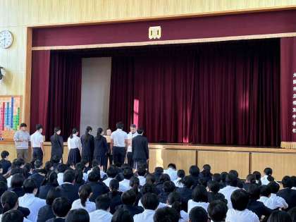 本日の全校集会では、東成区の御栗区長が来られ、東成区の中学2年生の中で体力テストの結果が1番良かった生徒が表彰されました。