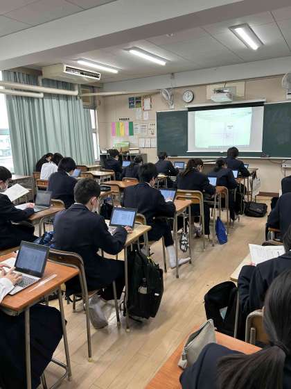 職場体験のまとめとして、タブレット端末を使って職場体験新聞を作っています。