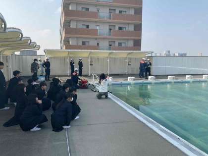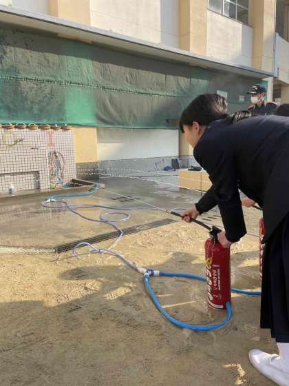 1年生の体験の様子です。消化器を使った放水の練習や、プールでは、ホースを使った放水の体験をしました。
