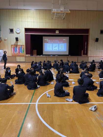 武道場では、心配蘇生法をテーマとして一次救命処置(BLS)を学び、AEDの使い方を練習しました。
