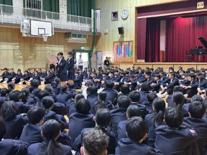写真は2年生のメッセージと、3年生からのメッセージを伝えている様子です。