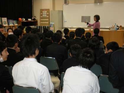 1月26日(火)に、パンジーおはなし会のご協力により、絵本の読み聞かせを行いました。1・2年生を中心に80名近くの生徒のみなさんが集まり、昼休みのほんの短い時間でしたが、楽しいひと時を過ごすことができました。