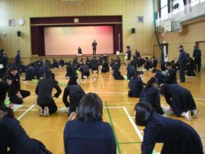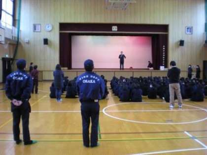 1月28日(木)に3年生で、心肺蘇生法講習会を行いました。先週の防災教室に引き続き、東成消防署から消防指司令 田中時治様をはじめ、東成消防署員の皆様方にお越しいただき、心肺蘇生法にについて実演を交えながら講義していただきました。