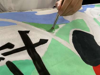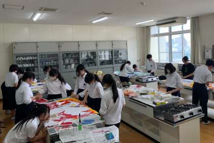 体育大会へ向けて、学級の団結を高めるため学級旗の制作をしています。2年生では、学級から選ばれた原案を元に、選抜メンバー5、6名により最優秀学級旗賞を目指し、各クラスの個性やアイデアを出し合いがんばっています。