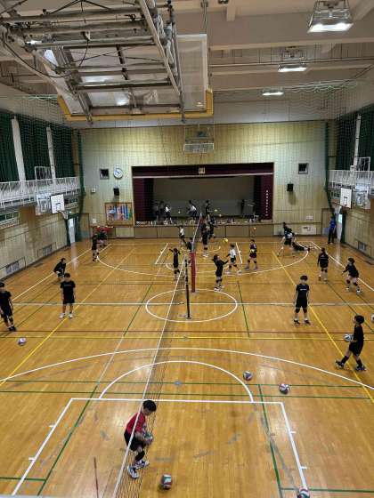 体育館で男女バレーボール部が練習しています。