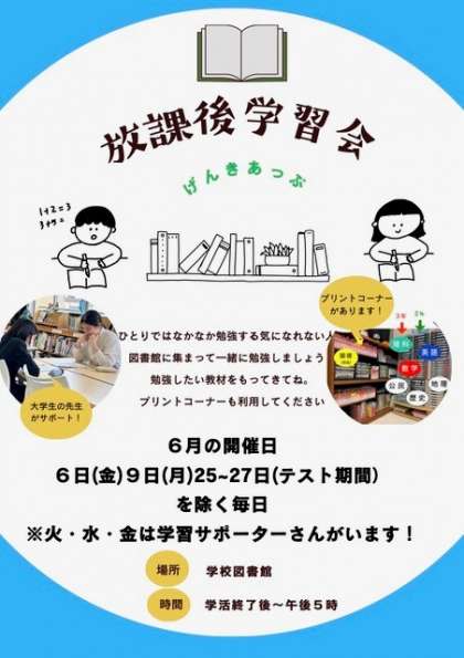 放課後学習会の案内と、げんきあっぷニュースレターを更新しました。上部タブの「配布文書」から入り、「学校元気アップ」カテゴリからご確認ください。