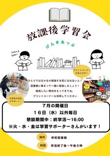 7月のげんきアップニュースレターと放課後学習会の案内を掲載しました。上部の「元気アップ」タブよりご確認ください。