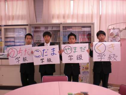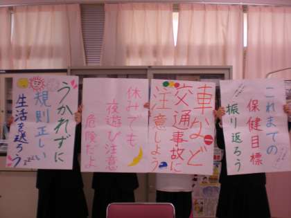 1年生最後の学年集会では、保健委員より各学級の担任の先生の名前を用いて、春休みの健康についてまとめた標語の発表が行われました。