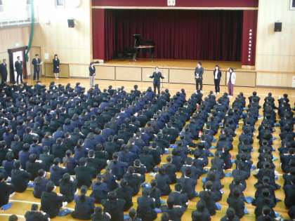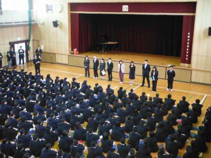 本日から平成28年度が始まり、前日の雨が嘘のように晴れ、心地よい日差しの中を登校してきました。新2年生・新3年生はクラス発表により、新しいクラスと教室を確認しました。その後、1・2・3年生そろっての始業式が行われました。体育館に集合し、校歌斉唱に始まり、緊張感の中に新しい環境への期待感が感じられる始業式であったと思います。始業式の後は新しい仲間とともに教室に移動し、担任と共に1年間の抱負など各学級ごとに取り組んでいる様子が伺えました。