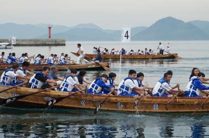 修学旅行2日目、バスで移動しフェリーに乗って大崎上島に行きました。大崎上島でまず最初に島の伝統である櫂伝馬を体験しました。練習後に1クラスを3艇に分けてクラス同士で代表のチームを決め、その後、各クラス代表による競争が行われました。初めは息が合わずなかなか早く進めませんでしたが大きな声をだし、お互いにリズムを合わせて練習を重ねるにつれ上達しました。