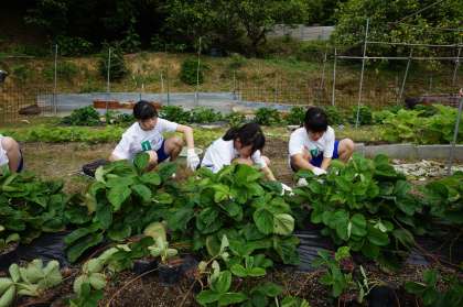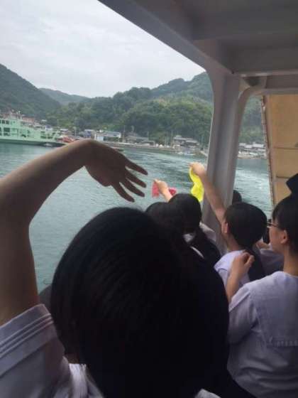 櫂伝馬体験が終わると各民泊家庭に移動して家業体験を行いました。畑やビニールハウスに行き作物を収穫する農業体験や、釣りなどをして都会では味わえない体験を行うことができました。3日目の午前中まで民泊家庭の家族として活動しました。そして最後の離島式では生徒と民泊家庭の方々からも別れを惜しみ涙する光景がありました。フェリーの甲板でお互い手を振り大崎上島に別れを告げました。