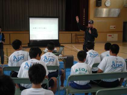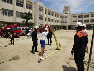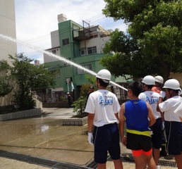 地震のメカニズムについて講義を受け、地域にある防災施設の確認や消火訓練などを行いました。震災がおきた時には、地域のリーダーとして活躍できるようたくさんのことを学びました。東成消防署・地域の方々と一緒に訓練を行い、交流も深まったように思います。