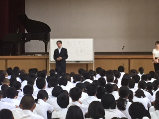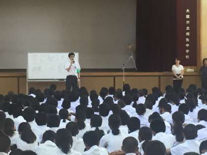 3年生を基準に式開始時刻には全員が整列できている素晴らしい状態で終業式が始まりました。式では「非認知スキル」や夏休み中には自分で「ルール」をつくり「時間」を有効に使い、「自制心」を養うことの大切さを校長先生がお話しされ、真剣に聞いている生徒の姿が伺えました。その後東成警察署と子ども相談センターの方々にもお越しいただき、携帯電話の使い方や、新しく自転車の法が変わることなど、夏休み中にトラブルに巻き込まれないようにするためのアドバイスをいただきました。1人ひとりが安全に充実した夏休みを過ごための再確認ができたと思います。その後、各学級での学活では夏休みに向けての目標を話し合い、元気に1学期の学業を終えました。次に全員がそろうのは8月5日の登校日です。全員がよい思い出を持って登校できるのを楽しみにしています。