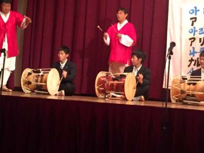 サムルノリは「チャンゴ」「プク」「チン」「ケンガリ」の4つの楽器からなる演奏で、力強い音を奏でており、生徒も聞き入っている様子がうかがえました。その後、学年の有志による「チャンゴ」の体験では慣れない楽器ではありましたが、しっかりと音を奏でることができました。