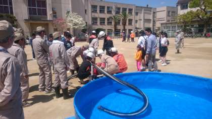 可搬式ポンプのエンジンを始動するのは中学生にとって少し難しかったようです。