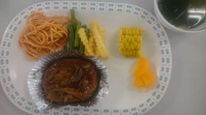 夕食が始まりました。朝から活動しているので、お腹がすいているようで、もりもり食べています。メインはハンバーグです。