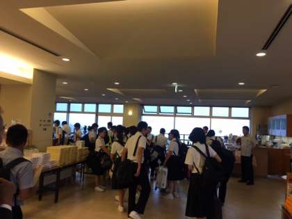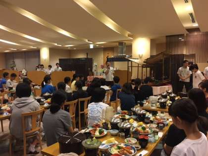 広島県を出発し愛媛県に移動しました。移動時間が長かったですが、バスの中ではレクリエーションで大いに盛り上がりました。ホテルに到着し入所式が行われました。各自部屋に入室し荷物整理をした後、お待ちかねの夕食タイムになりました。地元の食材をふんだんに使った料理をおいしくいただきました。