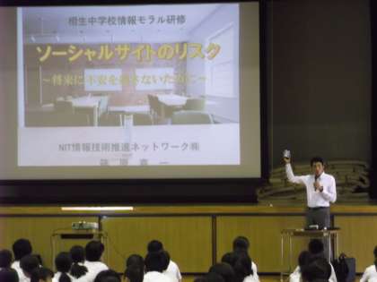 7月3日、NIT情報技術推進ネットワーク株式会社代表取締役の篠原嘉一先生にお越しいただき、全校生徒に向けて情報教育モラル講演会が行われました。ネット社会に潜む私たちの知らないシステムについて、映像や実際に機器を使って丁寧に説明していただきました。身近な問題であるので、子どもたちも熱心に耳を傾けていました。便利なものであるだけに、使い方には細心の注意を払わなければいけません。篠原先生におかれましては、ご多忙の中、本校の講習会のために貴重なお時間をいただきありがとうございました。