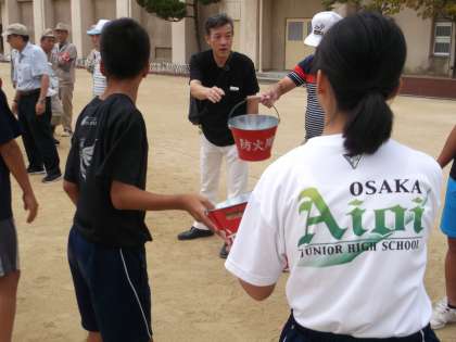8日メキシコで大地震がが発生し、大変な被害を受けました。5日には大阪880万人訓練も行われました。東成区の8地区でも3日、防災訓練が行われ、片江、神路地区の訓練に本校から30人近くの子どもたちが参加しました。簡易担架の作り方、消火器の使い方、バケツリレー、放水訓練など様々な知識を学びました。もし災害が起こったとき、消防隊が来るまでに、地域での初期対応が大切です。その時、中学生の力が絶対に必要で、このような訓練で学んでおくことは大変重要です。地域の方々とも交流することができ、有意義な訓練でした。