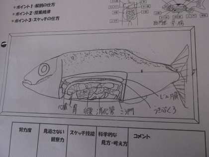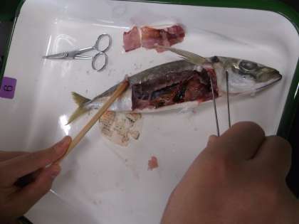 本日はアジを解剖ばさみで切り開き、内臓の観察をしました。
