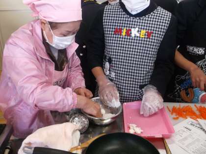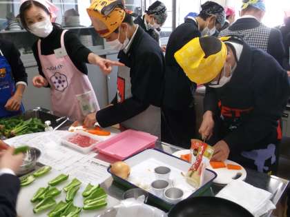 1月15日に1組、16日に2組で調理実習を行いました。メニューはチンジャオロースー、ほうれんそうのナムル、そしてデサートにみたらし団子を作りました。慣れない手つきではありますが、危なげなく包丁を使ったり、フライパンで炒めたりしました。また班員が協力し、調理や後片付けをスムーズに行うことができました。「めっちゃおいしい」「ピーマンが食べられるようになった」「料理はたいへん」など様々な感想が聞かれ、大変意義のある活動になりました。東成区食生活改善推進員協議会の皆様、東成区役所栄養指導員の繁田様、本当にありがとうございました。